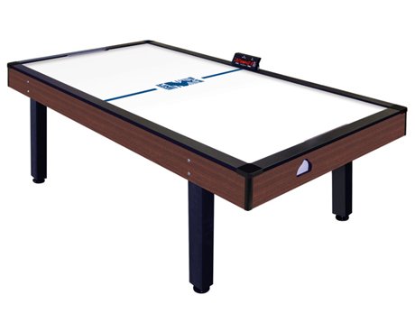 Shelti Wingman Air Hockey Table Play bang ’em up hockey without all the usual costs--like lost teeth. Get in there and mix it up in the comfort of your own home. The Blue Line Wingman’s fast moving puck glides over its ice-blue surface on a flow of continuous air. You have the same commercial grade blower motor found in our higher end model pushing air though a high pressure laminate playfield to thank for that. Play offense. Play defense. Play the Wingman all the time--it’s OK this air powered classic has arcade-like longevity. Its 6 side and end aprons--covered with an attractive “Walnut Melamine that’s chip mar and scratch resistant--press fit and screw into sturdy aluminum down-corners. From the top down the Wingman is responsive. When you hear the call to play this game will answer. Includes 3 pucks 2 mallets warranty statement & registration card assembly instructions and 2 wrenches. Dimensions 86 1/2L x 46 3/4W x 30H. Weight 290 lbs. Made in the USA by Shelti Inc. Features include