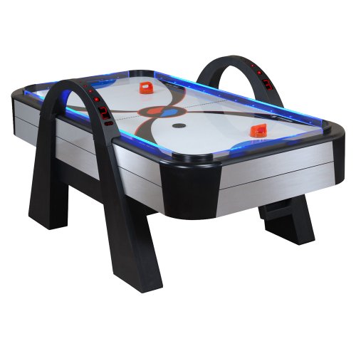 Sportcraft 90-Inch Extreme Hockey Table Modern design and unique features meet up in Sportcraft's 90" Extreme Turbo� Hockey Table. Massive side arches connect with an oversized apron to give the Extreme a sturdy well constructed game table. You'll need a solid table like this with all the hours you'll be spending around it. The playing surface is constructed of a high gloss acrylic for super fast play. Lighting effects in the arches and acrylic side rails react to game play giving a new look to the fast action. Large 3 inch LED scoring for home and visitor can be found on either side of the arches. Offers "upright" assembly which means there is no flipping of the table for final placement. Comes with 4 pushers and 4 pucks. (Assembled dimensions: 89.75"L x 48"W x 32"H)